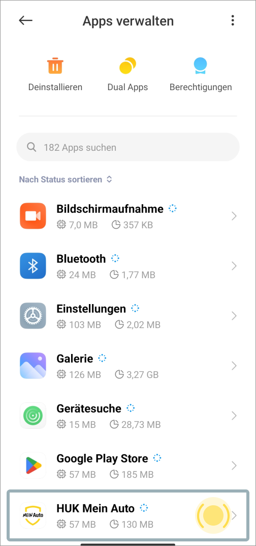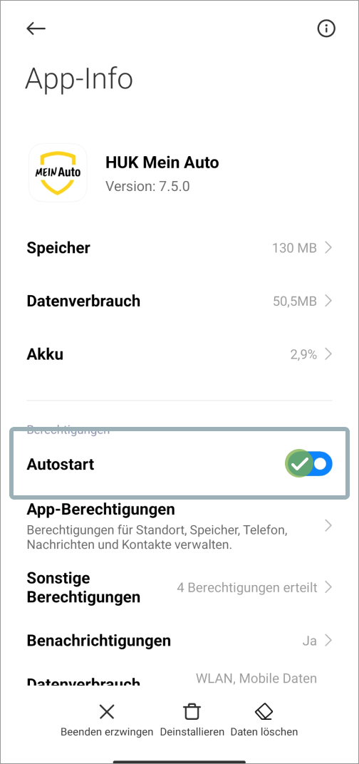 Sie nutzen ein Xiaomi-Smartphone mit MIUI 13 oder niedriger. Bitte öffnen Sie die Einstellungen Ihres Smartphones und folgen Sie den Schritten, um eine Fahrtaufzeichnung zu ermöglichen. Autostart muss aktiviert sein.